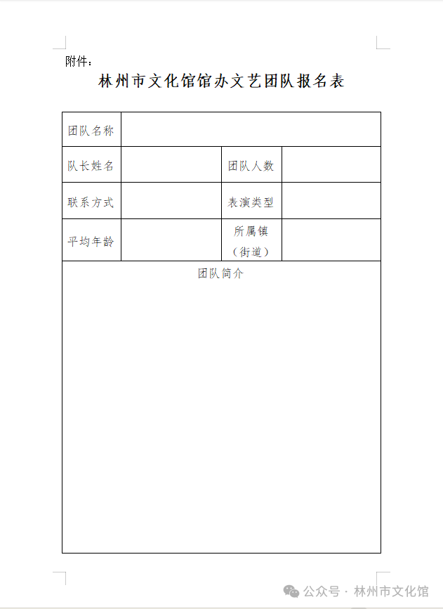 林州市范围内,具备一定艺术水平和表演能力的各类群众文艺团队、文化合作社,包括综艺、戏曲、合唱、舞蹈、器乐、曲艺等艺术表演形式。