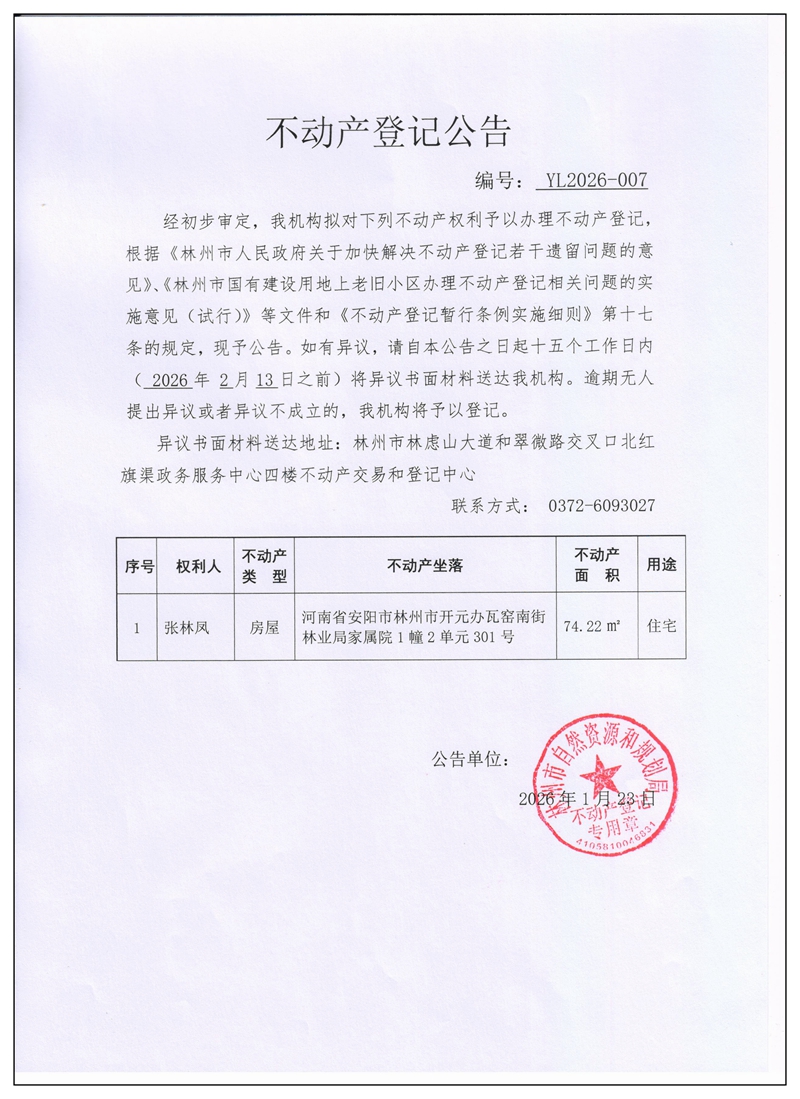 不动产登记公告YL2026第007号