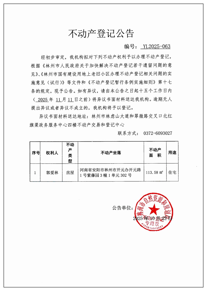 不动产登记公告YL2025第063号