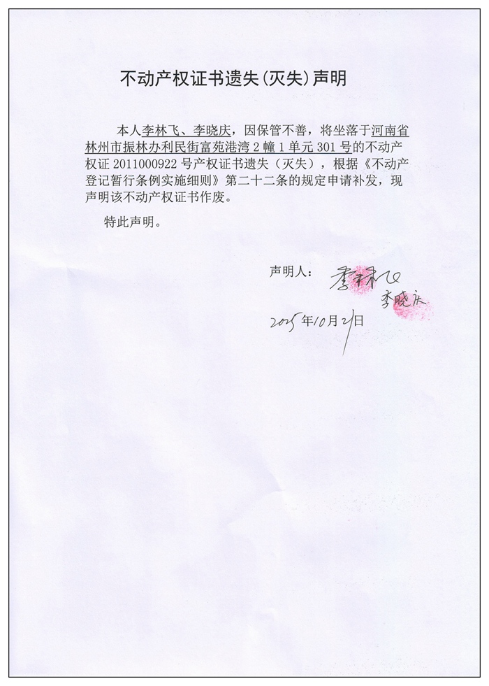 不动产权证书遗失(灭失)声明2025072