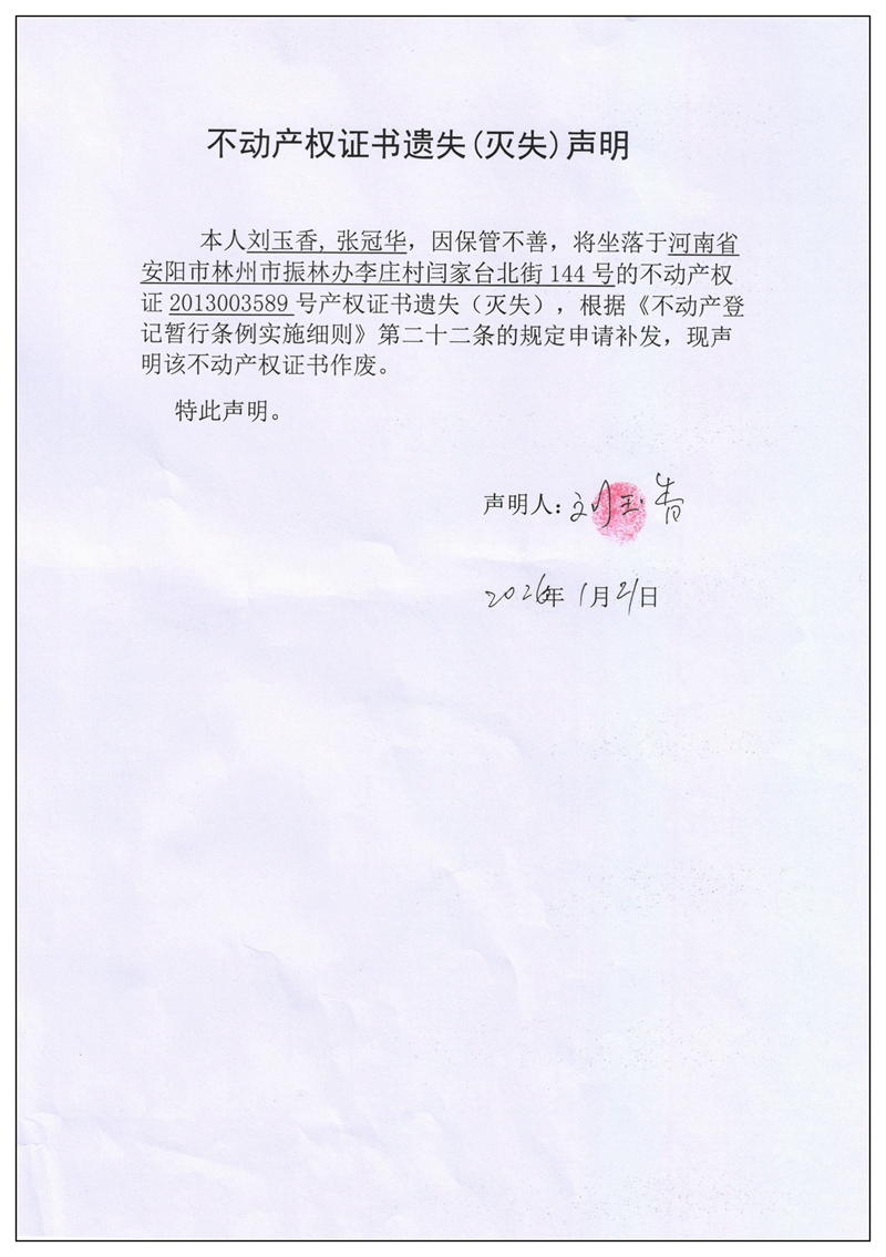 不动产权证书遗失(灭失)声明2026006