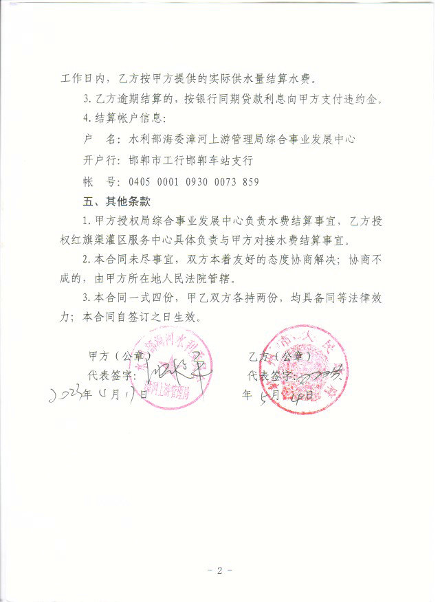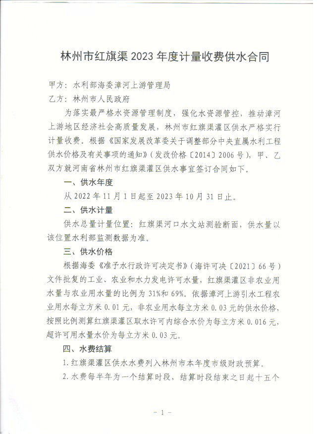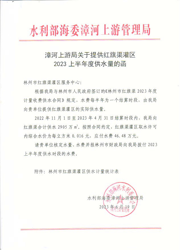 红旗渠灌区服务中心上半年漳河水费