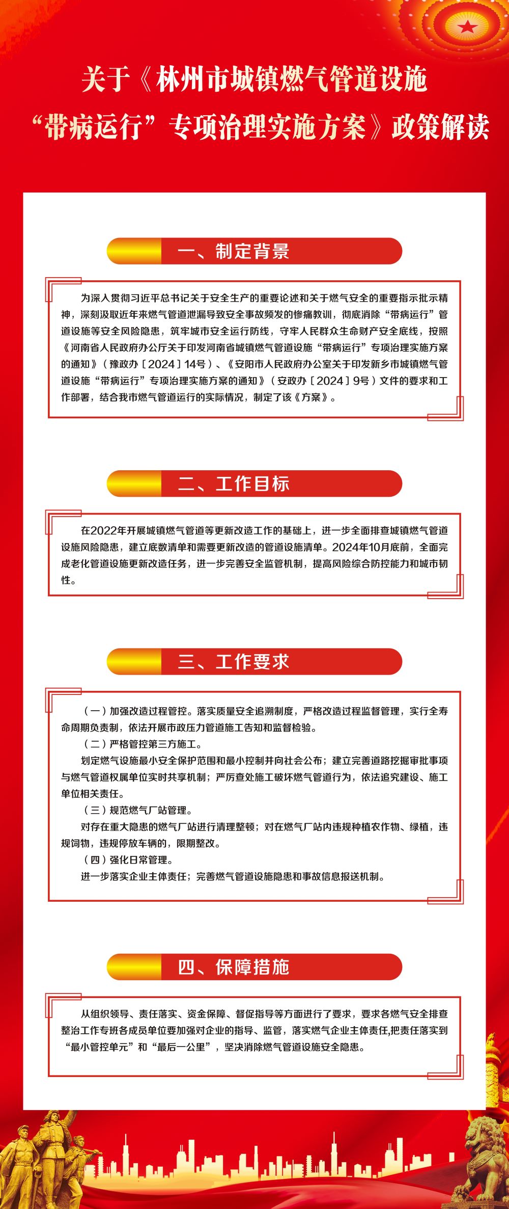 为深入贯彻习近平总书记关于安全生产的重要论述和关于燃气安全的重要指示批示精神,深刻汲取近年来燃气管道泄漏导致安全事故频发的惨痛教训,彻底消除“带病运行”管道设施等安全风险隐患,筑牢城市安全运行防线,守牢人民群众生命财产安全底线,按照《河南省人民政府办公厅关于印发河南省城镇燃气管道设施“带病运行”专项治理实施方案的通知》(豫政办〔2024〕14号)、《安阳市人民政府办公室关于印发新乡市城镇燃气管道设施“带病运行”专项治理实施方案的通知》(安政办〔2024〕9号)文件的要求和工作部署,结合我市燃气管道运行的实际情况,制定了该《方案》。
