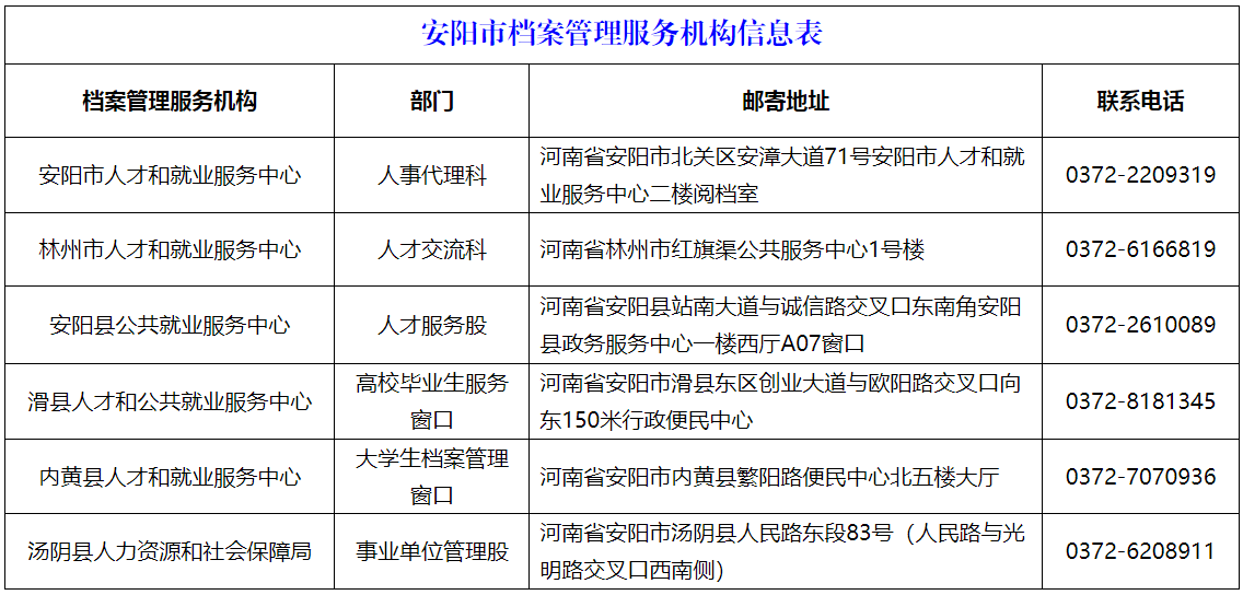 (二)请参照《安阳市档案管理服务机构信息表》拨打户籍地公共就业人才服务机构电话进行查询,或到现场查询。
