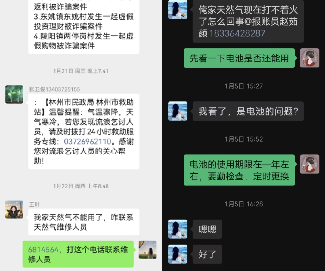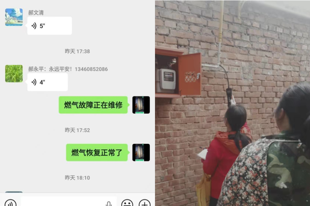 牛家岗村村民王某咨询燃气维修电话,村干部秒发号码。中石阵村村民郝某、栗家洼村村民宋某反映燃气无法使用或打不着火,村干部立即在线支招并联系维修人员上门,迅速解决。