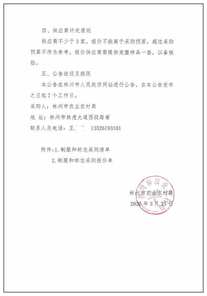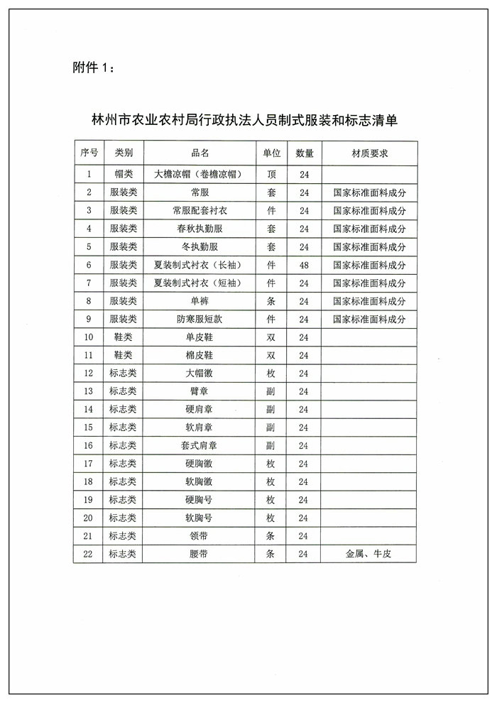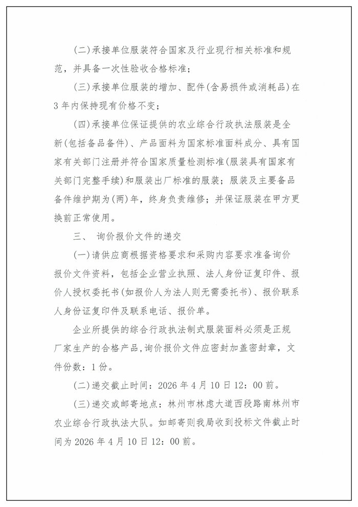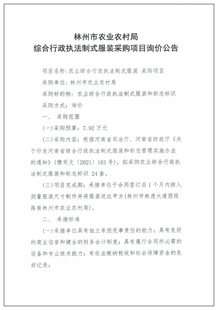 林州市农业农村局综合行政执法制式服装采购项目询价公告