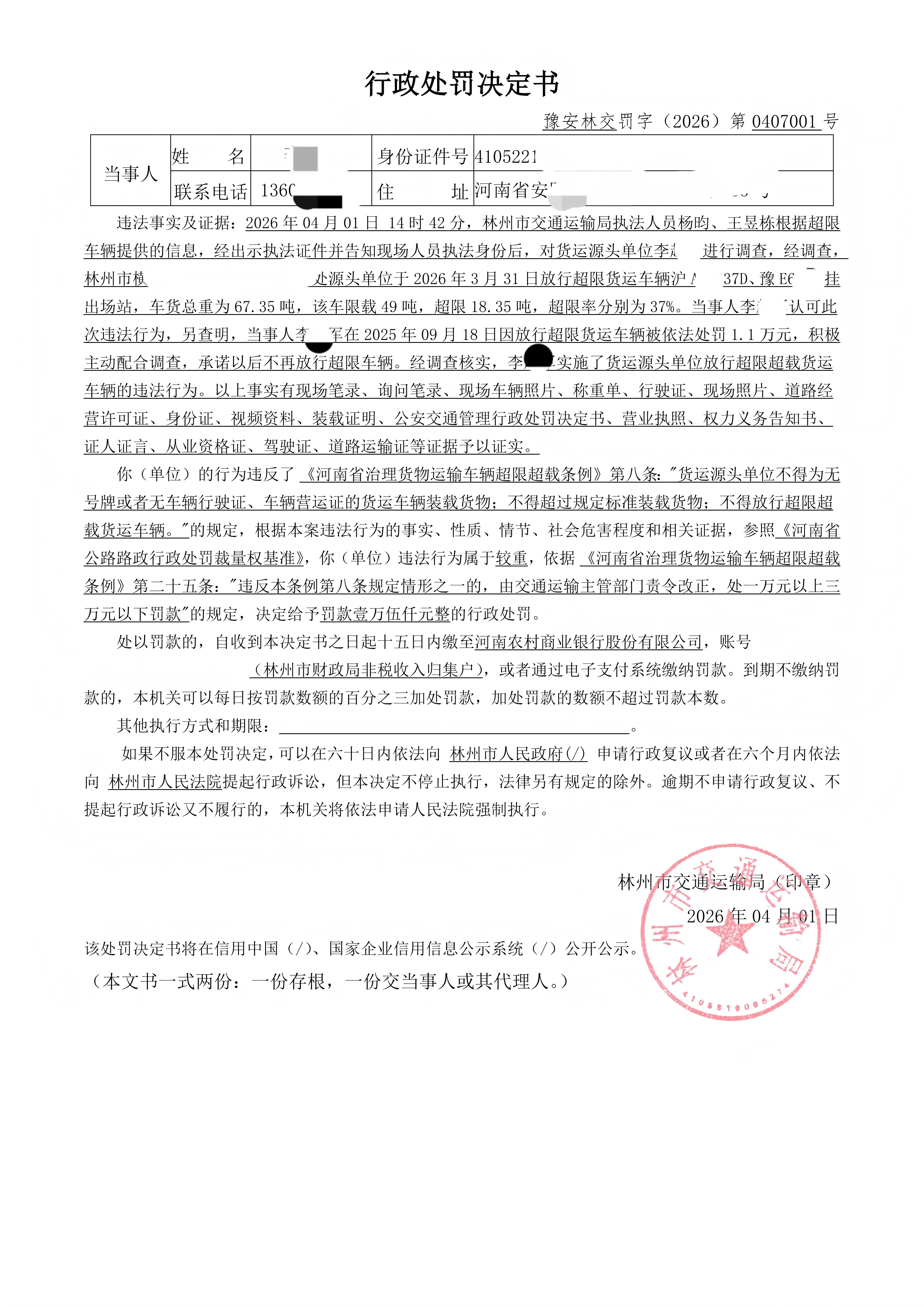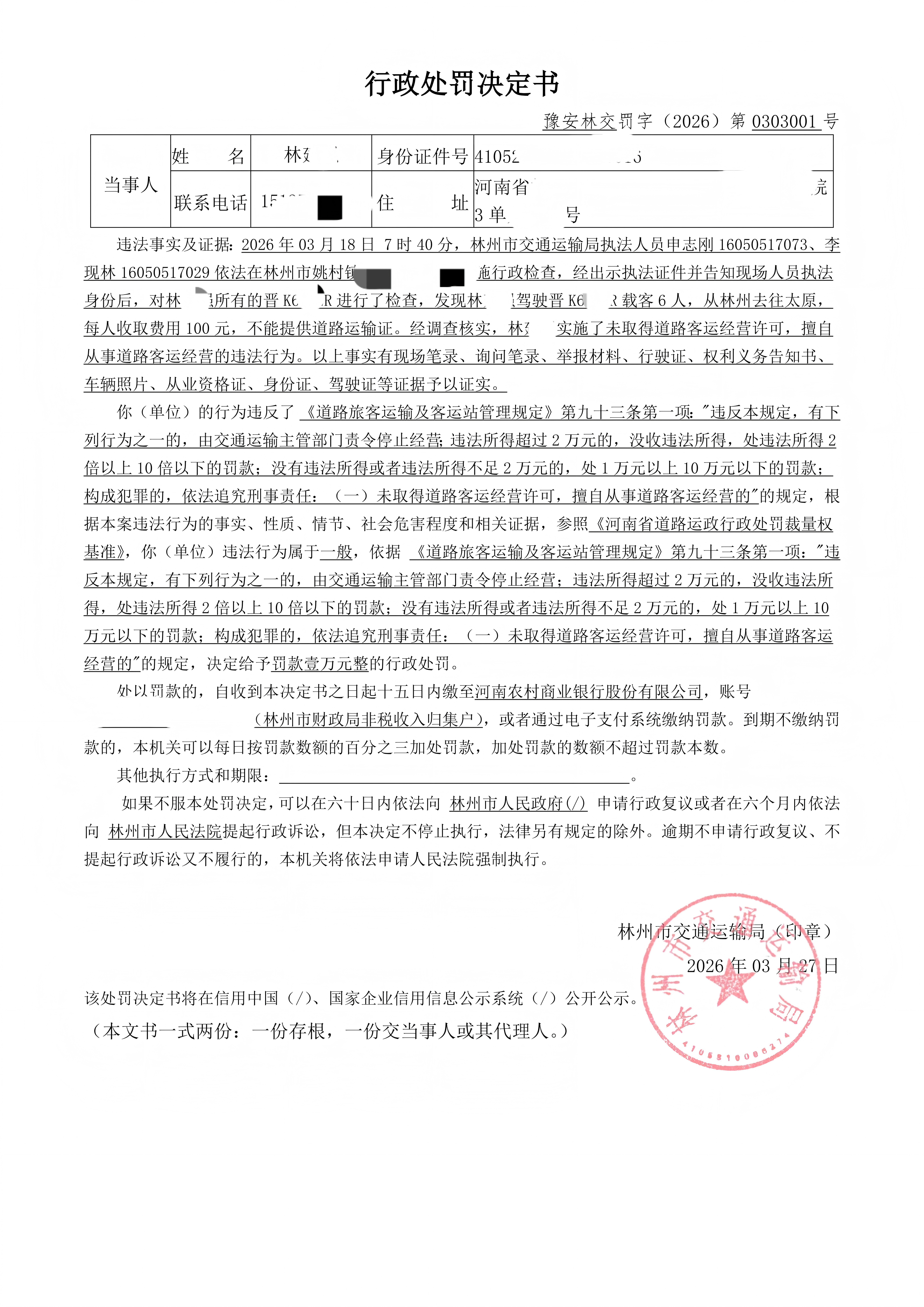 林州市交通运输局行政处罚